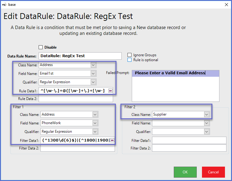 - This Data Rule will require a valid Email Address when a valid Phone Number has been added for a Supplier