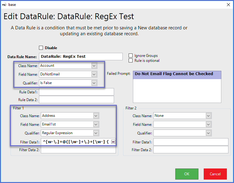 - In this example, the Data Rule is stating that an Account's Do NOt Email flag must be disabled