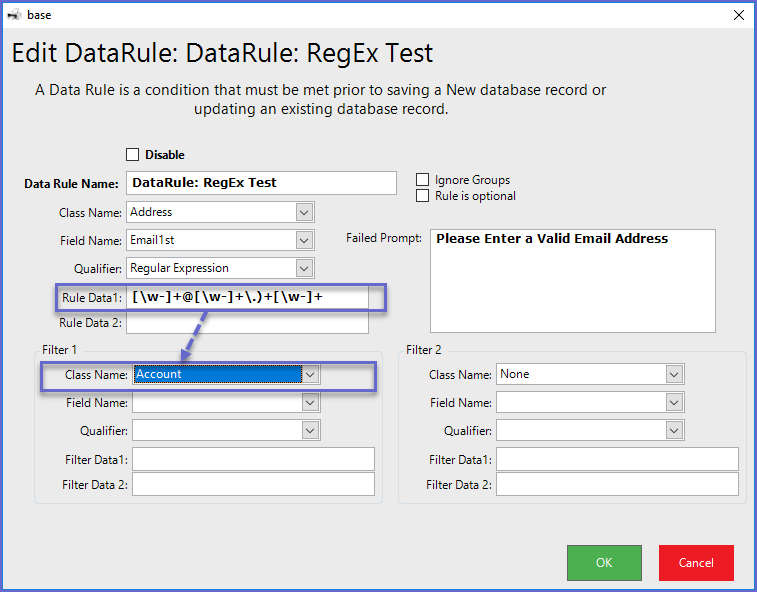 - In this example, based on the Regular Expression that is being used in, a valid email address will be required in the Email1 Field anywhere in Backoffice that contains Address Details, otherwise, the operator will receive the Failed Prompt Please Enter A Valid Email Address