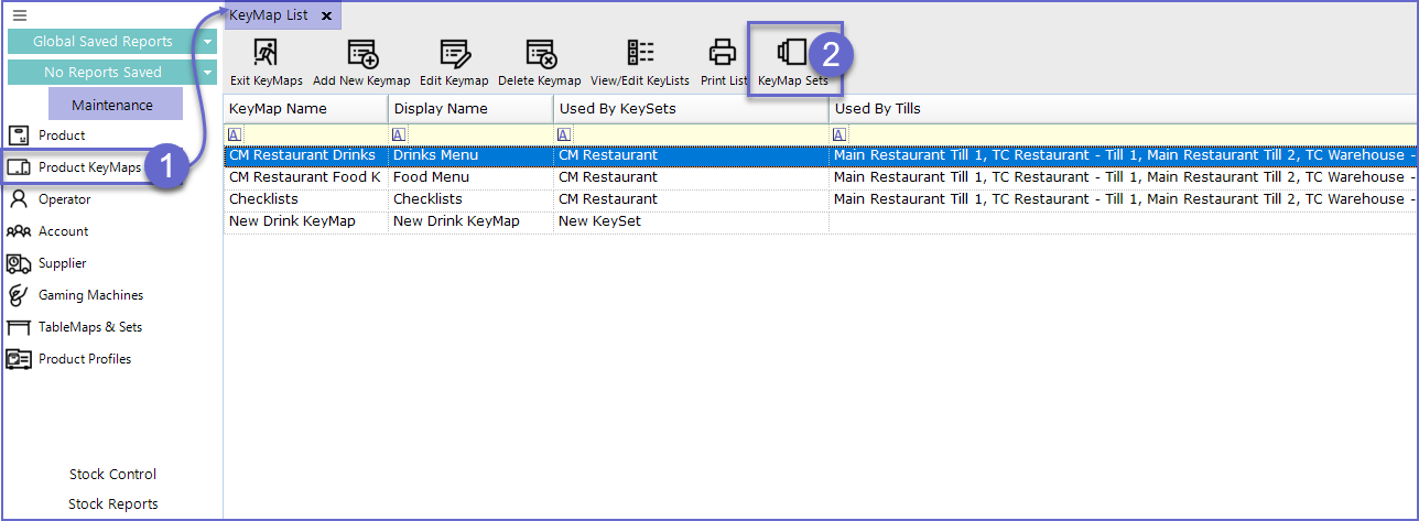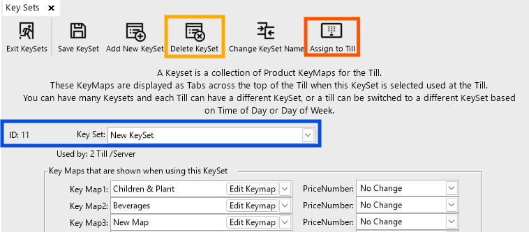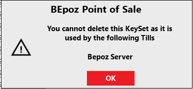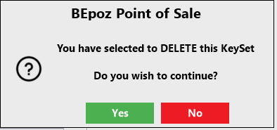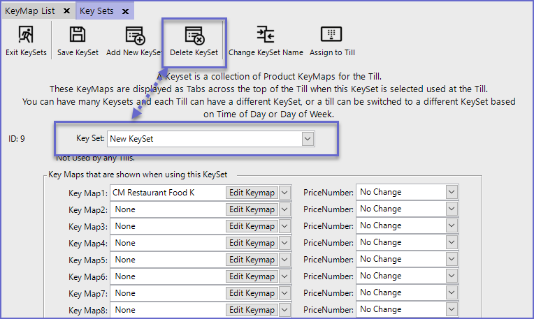 If required, KeySets can be deleted within the Product KeyMaps Menu. A KeySet cannot be deleted if it is assigned to a SmartPOS Workstation.