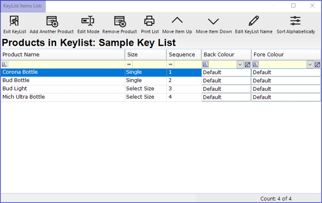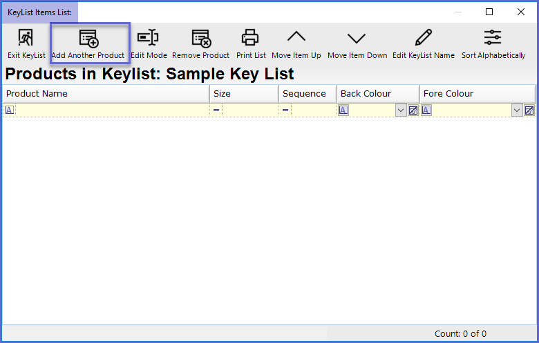 - A new window will open titled KeyList Item List which will display a list of all the Products added to the KeyList