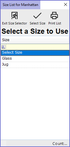 - Select the size either by double-clicking on the Size or highlighting the Size and clicking the Select Size button in the Header Section