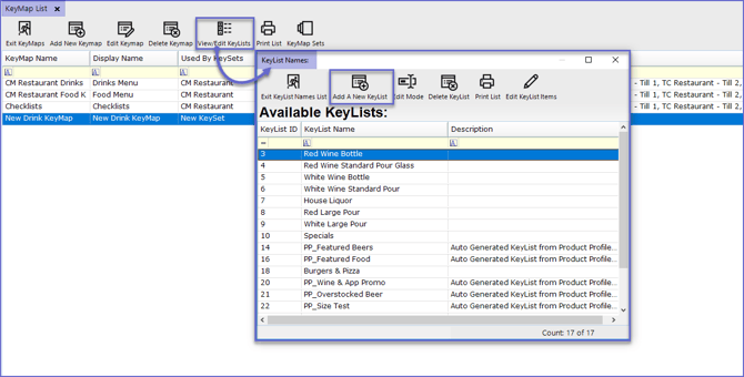 - Click on the View/Edit KeyLists button from the Header which will open the KeyList Names window.