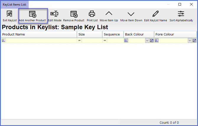 - Repeat these steps to Add all of the Products and their required Sizes to the KeyList