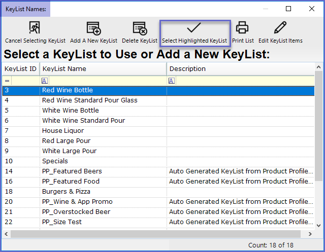 - A KeyList Names window will open which will display all existing KeyLists in the database