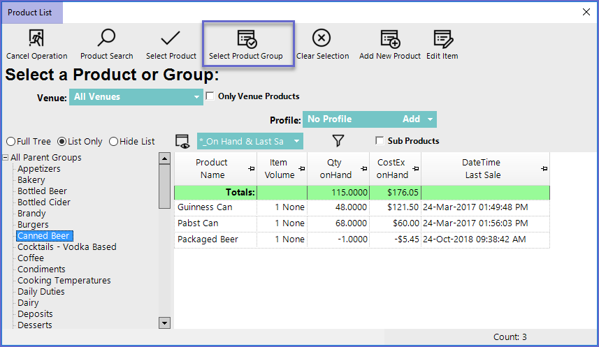 - To select a Group, either highlight a Group Name in the List and click the Select Product Group button, or double-click on the desired Group Name