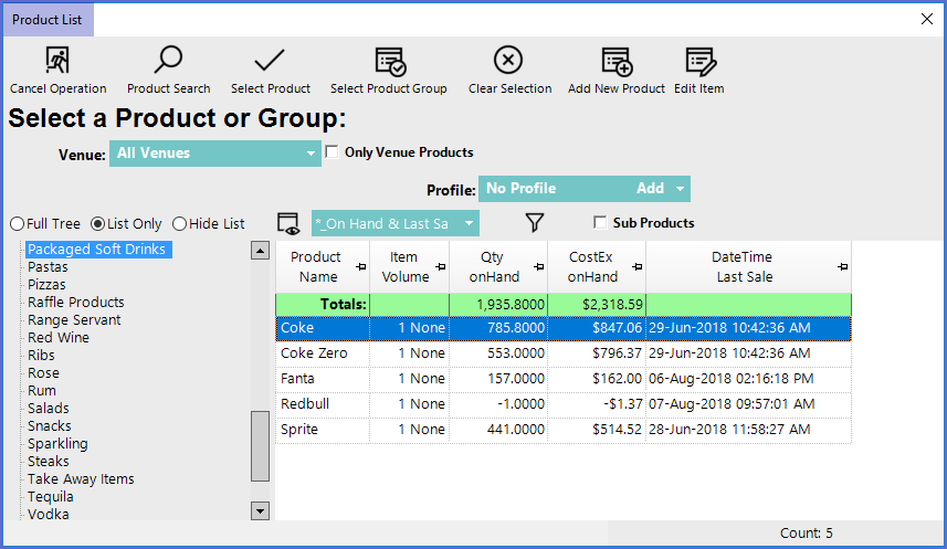 - Both of the options will open a Product List window prompting operators to select a Group to display in that Key Space