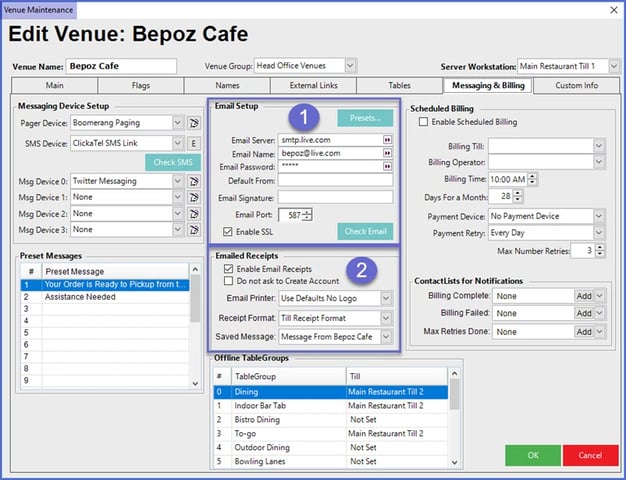 Under Edit Venue settings in the Messaging & Billing Tab, the email setup requirements need to be configured with end-user email settings (1)