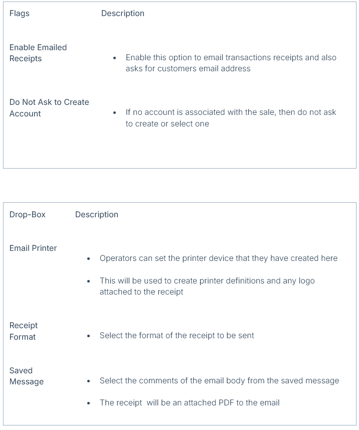 In the Email Receipts section, there are two flagged options and three drop-down options which are explained below