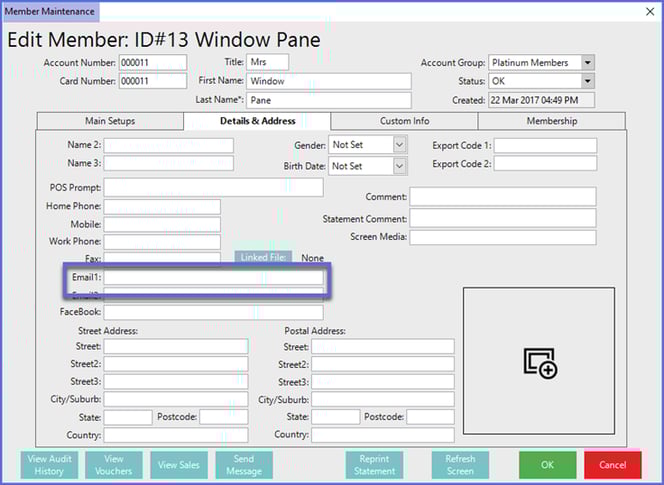 After opening the Maintenance window, navigate to the Details & Address tab and enter the desired Email Address into the Email1 field