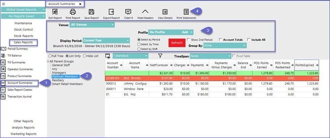 Select Sales Reports from the menu and select Account Summaries beneath that, which will open an Account Summaries Tab