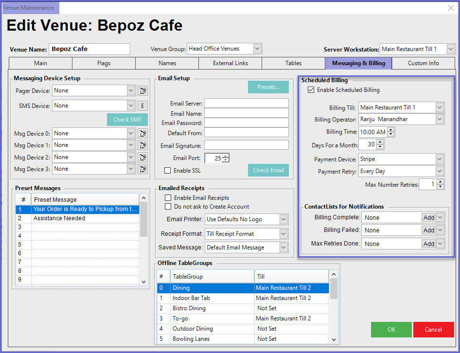This article explains the process of setting Stripe as a Scheduled Billing device in Venue Maintenance. After a Stripe Device has been set up in Backoffice , the next step is to enable Stripe for Scheduled Billing. This is completed within Venue Maintenance.