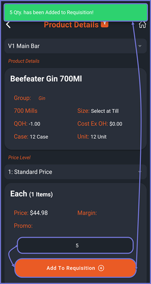 • Proceed to add a quantity for the selected product in the 'Enter Qty' field within the Price Level card and click on the 'Add to Requisition' button
