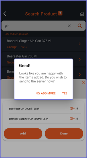 • Once the Operator clicks on Done, the app prompts with a Yes and No, Add More selection