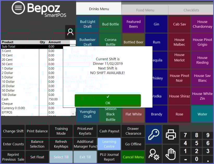 After Posting the Counted Totals, the current Shift can be ended at the Workstation to begin the next Shift.