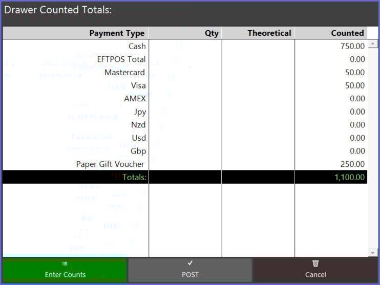 - After tapping the Enter Counts function button, a window will open displaying Drawer Counted Totals with four (4) columns - Payment Type, Quantity, Theoretical, and Counted