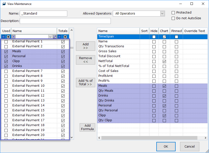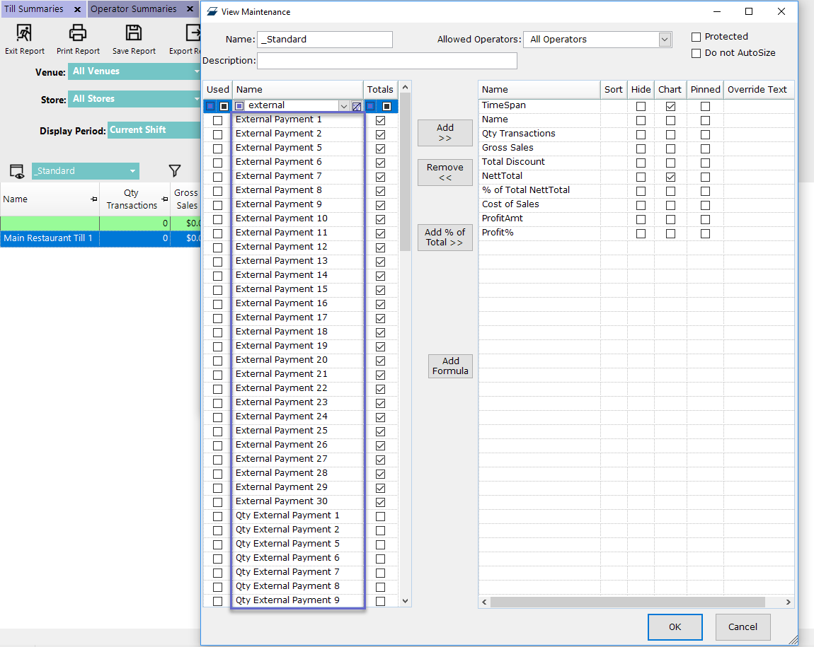 - Reporting Fields for all 30 External Payment Names can be added to Till Summaries and to Operator Summaries