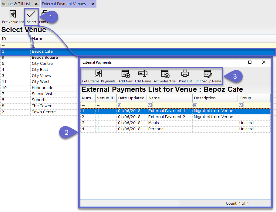 This article covers the External Payments component and how it can be accessed and configured in BackOffice to setup External Payments for use in the system. Within this component, thirty (30) External Payment Names are supported and can be configured per Venue. External Payment Names can also be Grouped which is used on the Till Balance Report. Additional Reporting Fields cater for all 30 External Payment Names.
