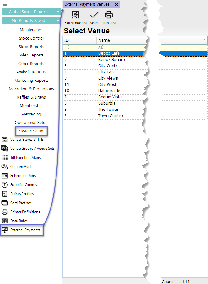 - External Payments are accessed via the System Setup menu in BackOffice