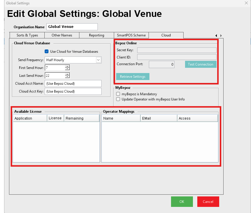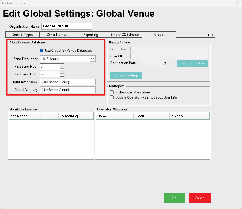 This Tab contains all configurations necessary for Organization-wide implementation: Cloud Venue Database and Bepoz Online