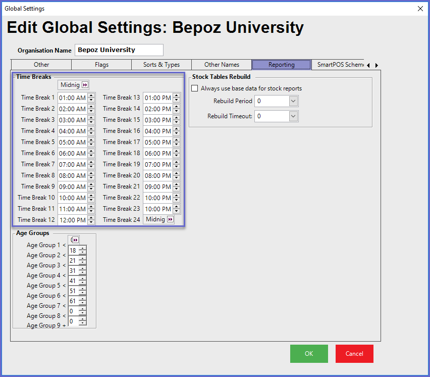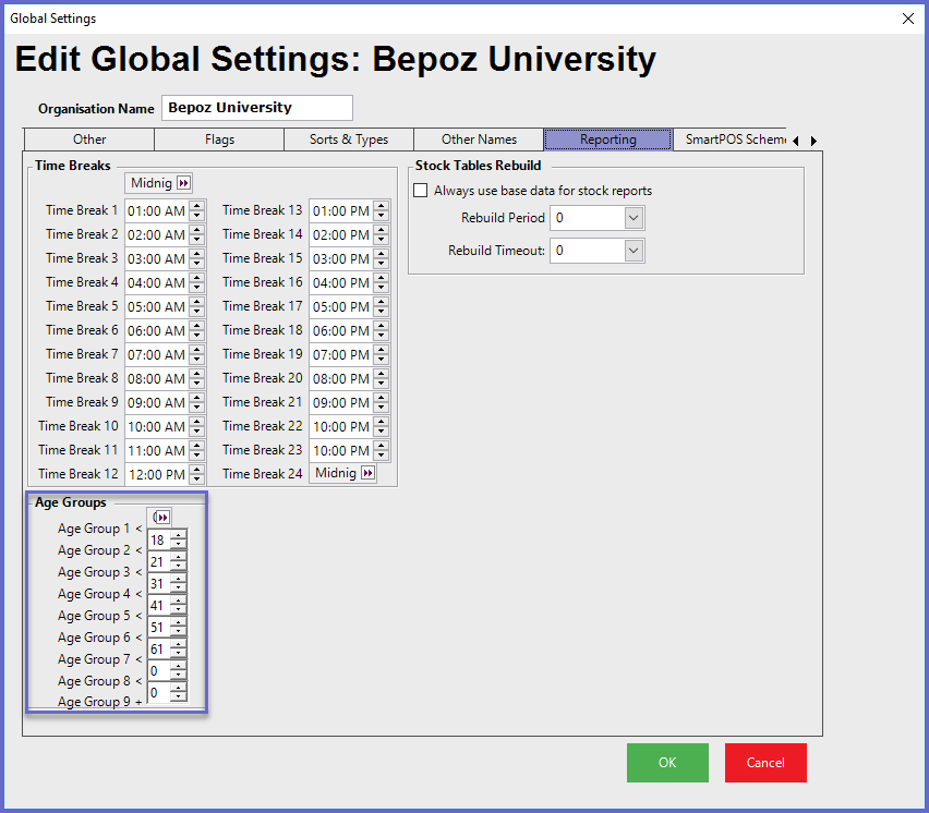 The "Reporting" Tab within Global Settings contains sections for configuring Time Breaks and Age Groups to be used throughout the Organization.