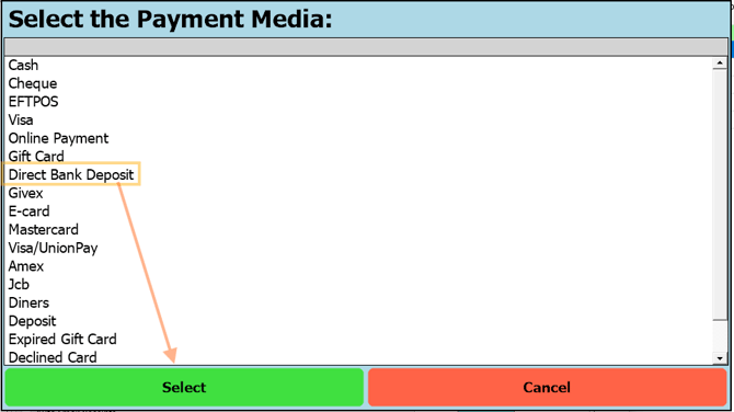 - Highlight the appropriate Payment Method. E.g Direct Bank Deposit and click Select