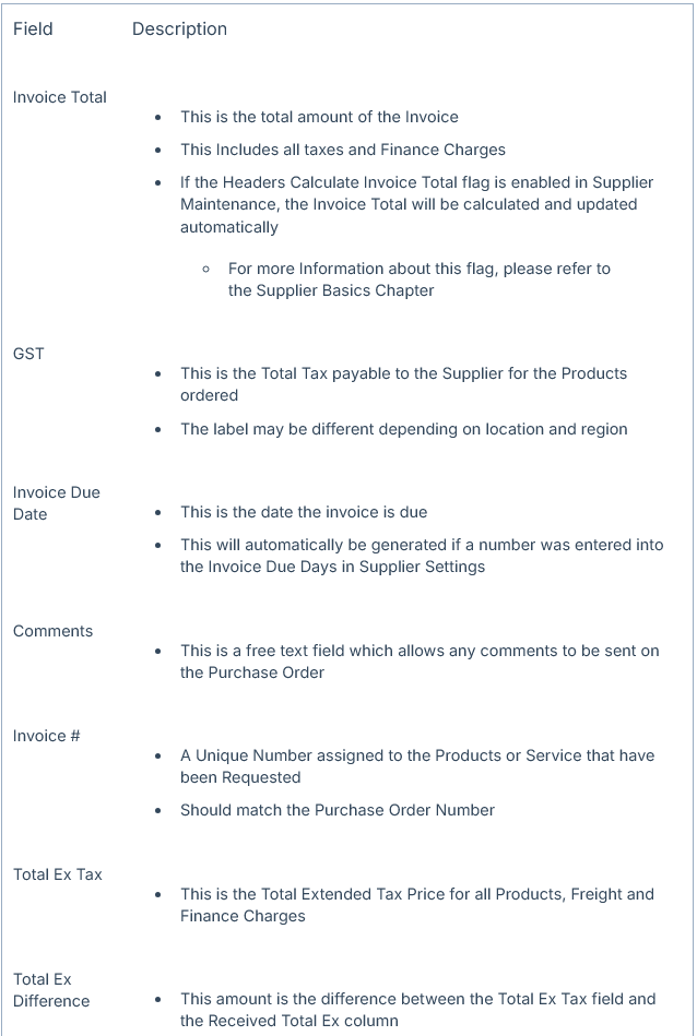 The Invoice Header Details contains the basic information when managing Purchase Orders.