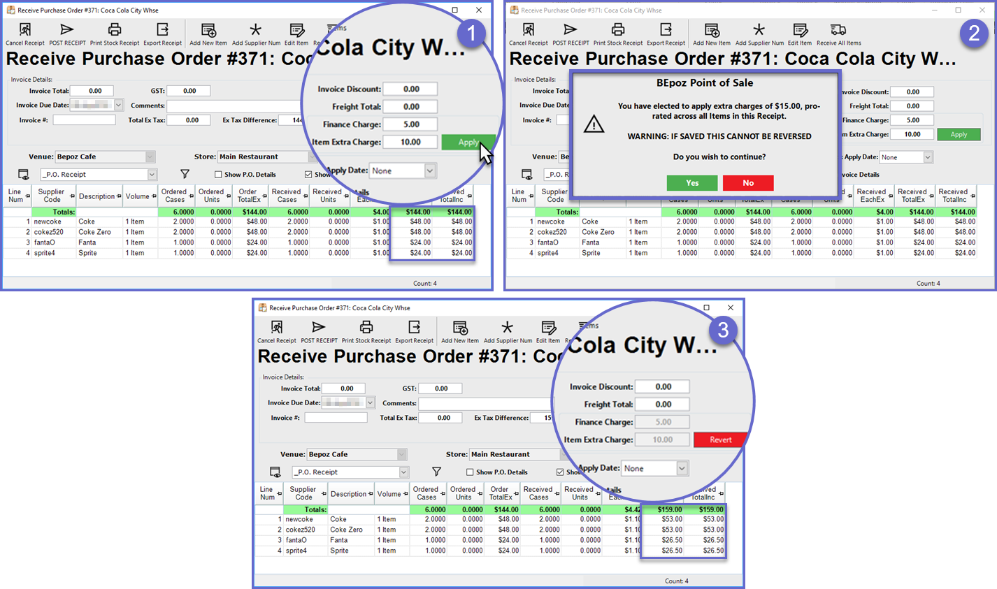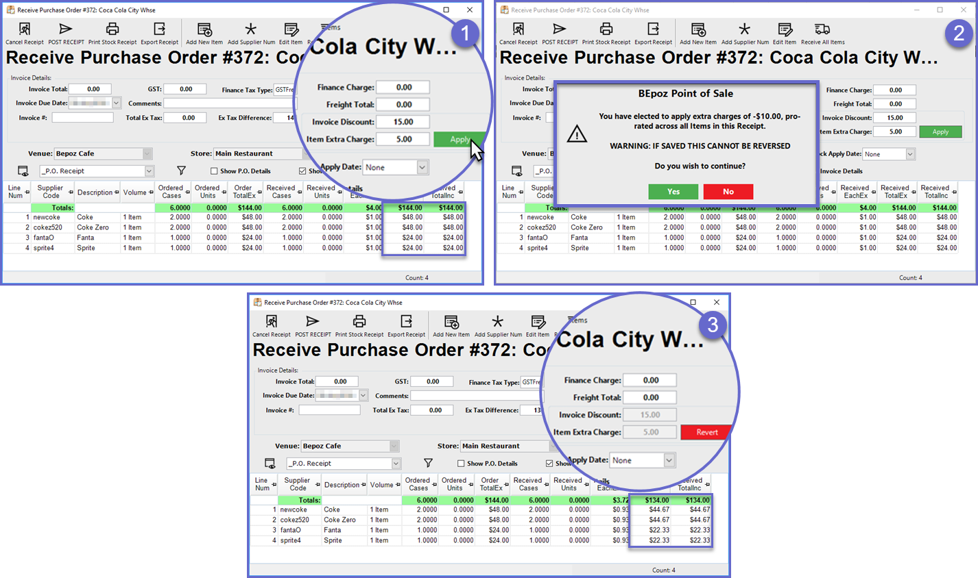 - The Total Amount of any Item Extra Charges minus (-) Invoice Discount will then be pro-rated among the Products in the Receipt