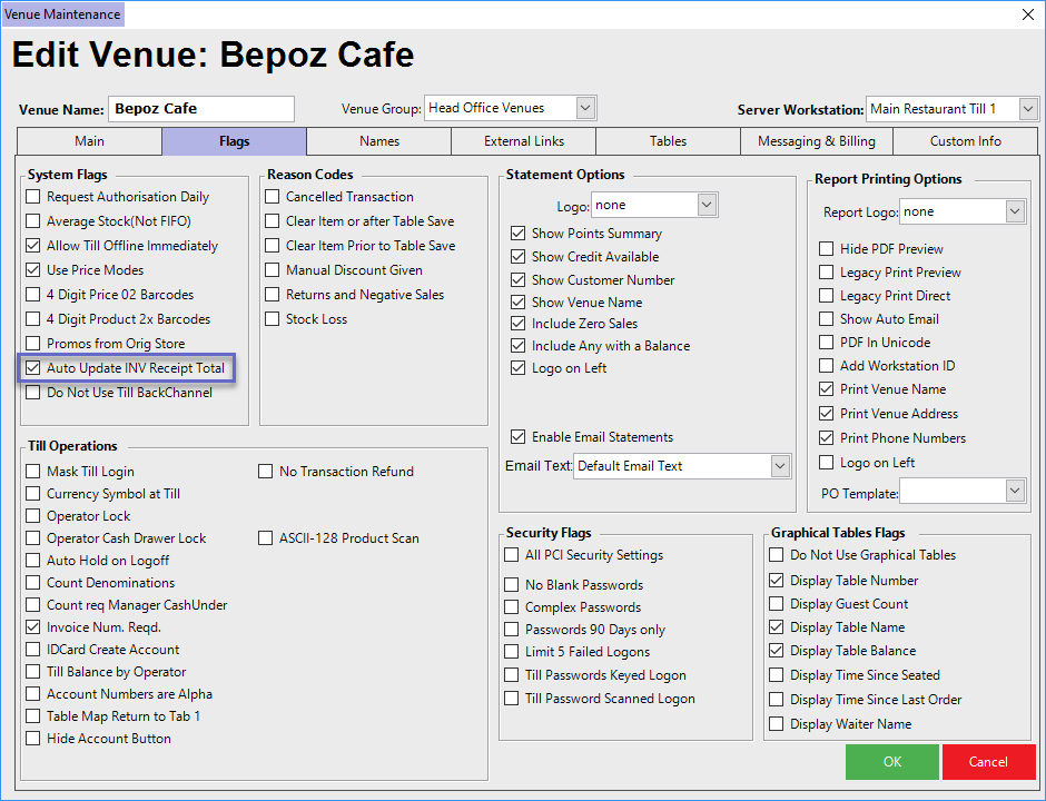 - This flag works similar to the Venue Maintenance flag called "Auto Update INV Receipt Total" which will update the Invoice Total and Total Ex Tax fields on Receipts
