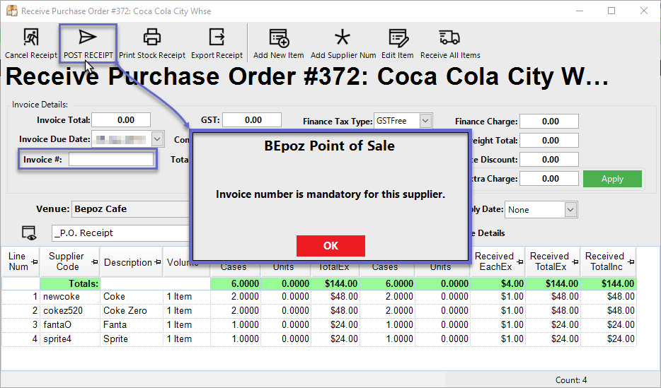 - When this flag is enabled for a Supplier, all Receipts will require an Invoice Number prior to being Posted