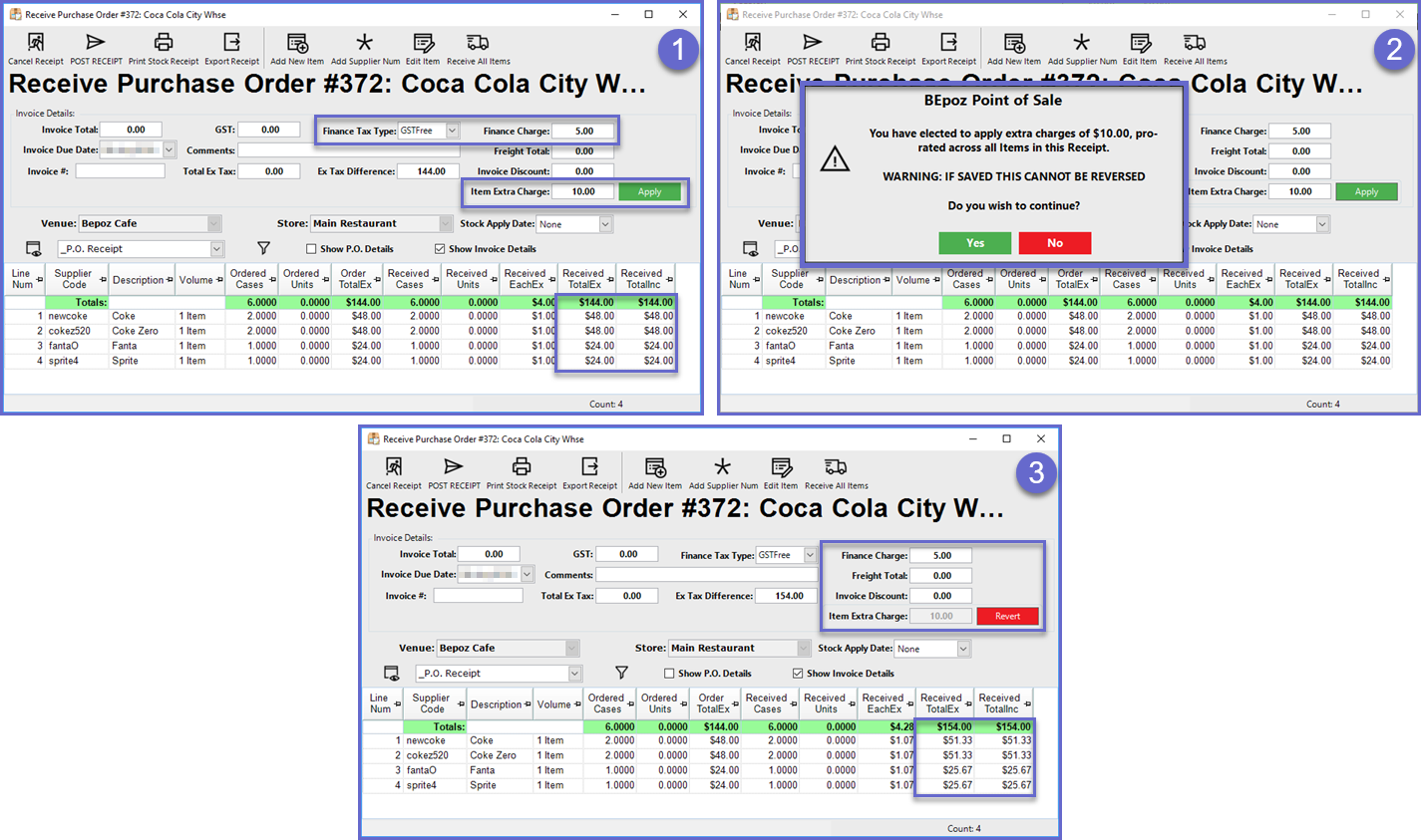 - When the Finance Charge as Item Extra Charge flag is enabled for a Supplier, then when Receiving Purchase Orders for that Supplier any Finance Charge added will be treated as an Item Extra Charge and will be pro-rated across all Products in the Receipt