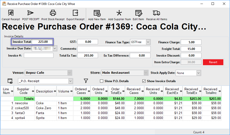 - When the Invoice Discount as Item Extra Charge flag is enabled for a Supplier, then when Receiving Purchase Orders for that Supplier any Invoice Discount added will be calculated with any Item Extra Charge and will be pro-rated across all Products in the Receipt