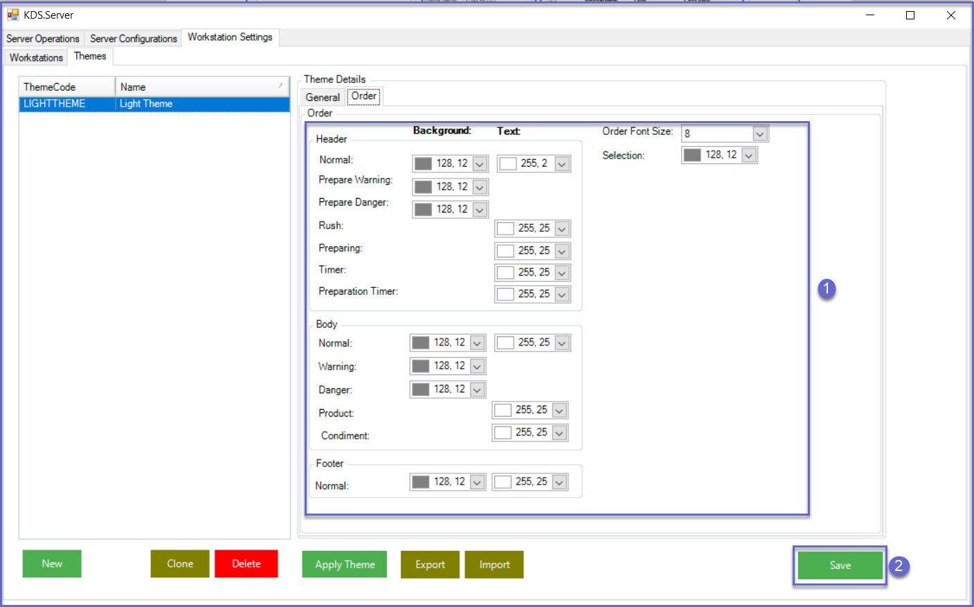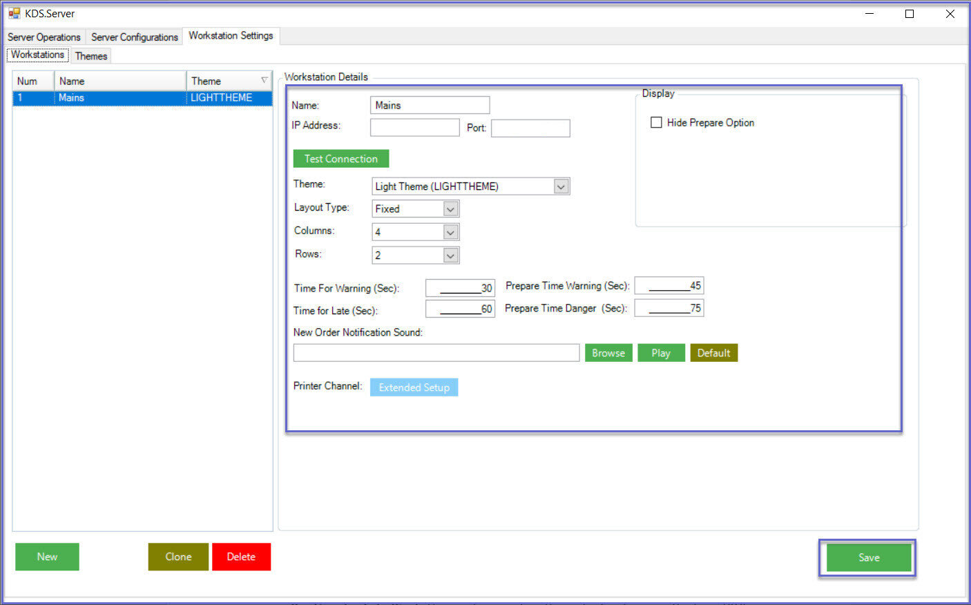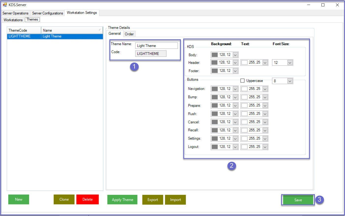 The SmartKDS is used to display items added to Orders on SmartPOS terminals to the kitchen staff on different workstations. s covers setup-by-step guide required to configure the KDS Workstation. Prerequisites N/A Getting Started Workstation Settings Once SmartKDS Server Configuration is completed , click on the ‘Workstation Settings’ tab to create themes and setup the workstation. Themes- General Navigate to the subtab 'Themes' and enter the theme name which you want to create.