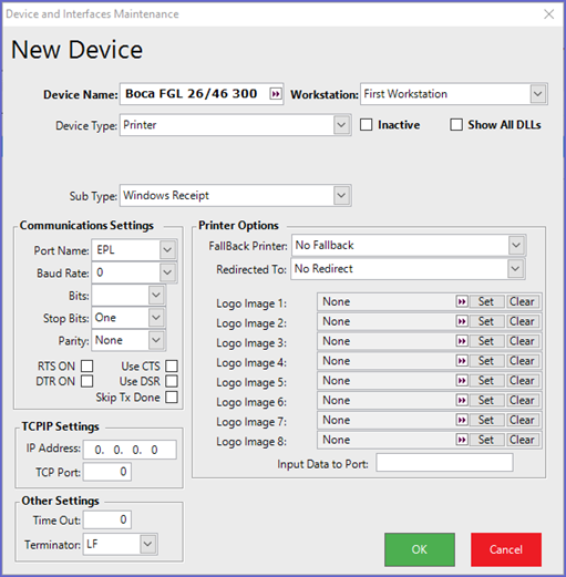 The Device Name must match the device name that the device is called in windows. e.g. Boca FGL 26/46 300 DPI