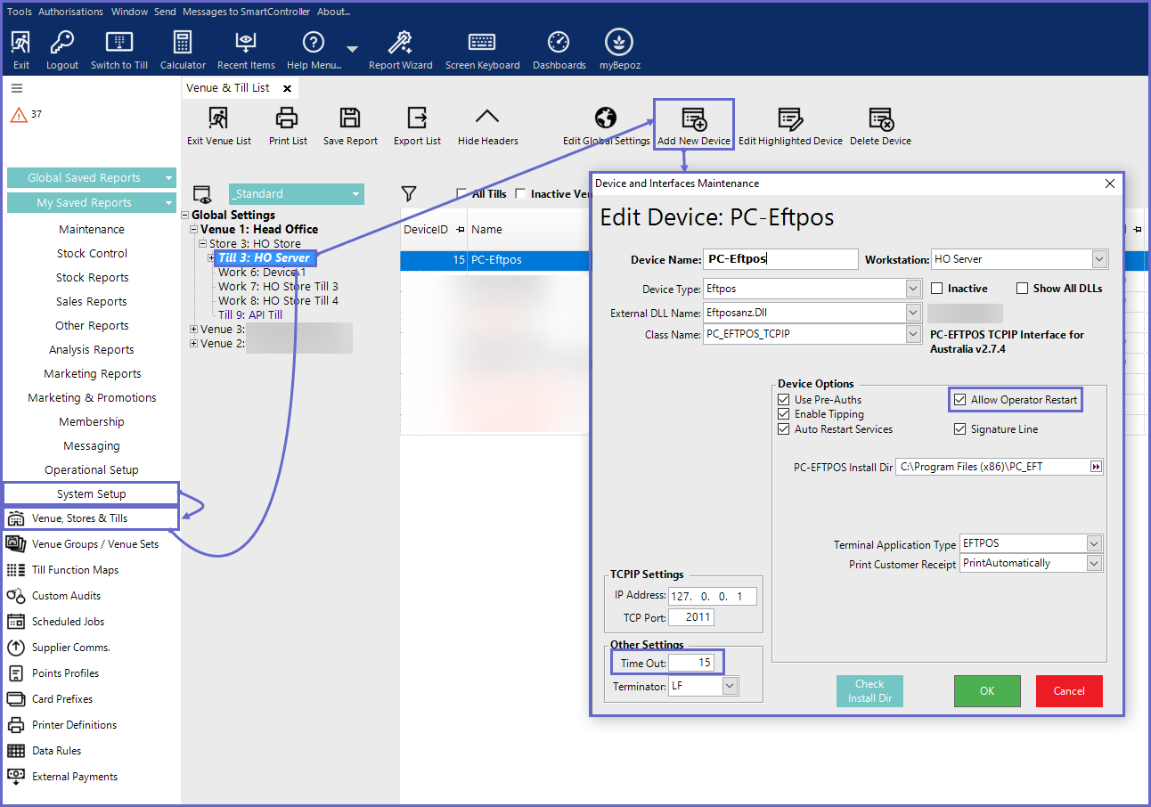 PC-EFTPOS TCPIP (v4.6) & create a new device - Go to the System Setup tab from the side menu and select 'Venue, Stores & Till'