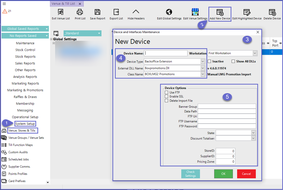 - Enter a relevant Device Name, set the Device Type as 'BackOffice Extension', the External DLL Name as 'Boxpromotions.Dll', and the Class Name should be 'BOXLMG2 Promotions'