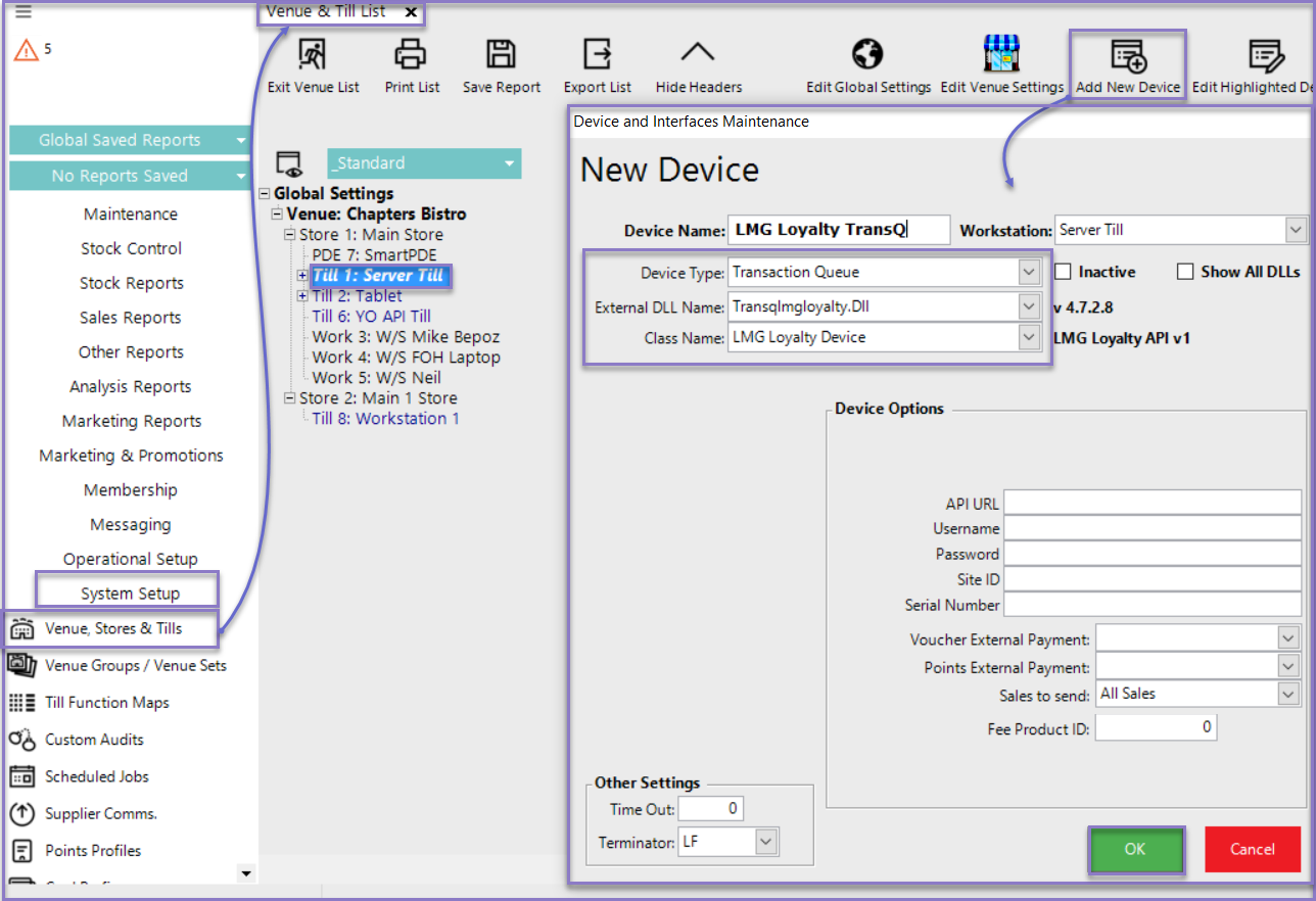 - After logging into BackOffice, complete the following steps to create & configure a LMG Loyalty Transaction Queue Device: