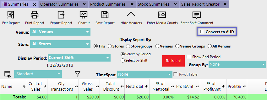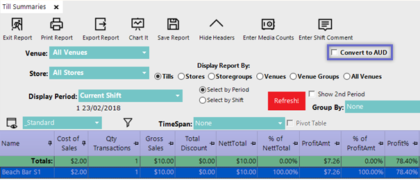 - When running a Till Summaries Report for any Venue/s that use/s an alternate Local Currency to the Organization's Base Currency, the Convert to XXX flag can be used to toggle between viewing the data as the Venues' Local Currency or viewing as the Organization's Base Currency