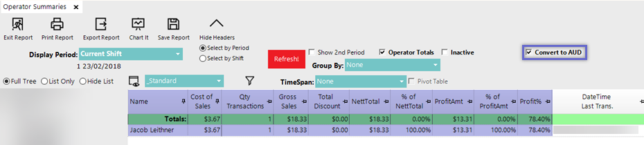 - When running an Operator Summaries Report, any Operators who have Transactions in a Venue/s that uses a Local Currency different to the Organization's Base Currency will have data affected by the Convert to XXX flag