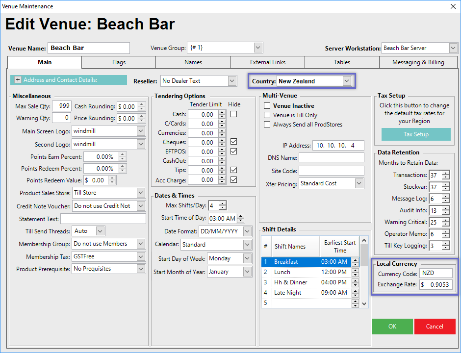 - The Local Currency fields only need to be set if the Venue uses an alternate Local Currency than is set as the Global Setting Base Currency Code