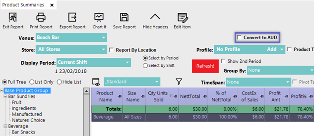- When running a Product Summaries Report for any Venue/s that use/s an alternate Local Currency to the Organization's Base Currency, the Convert to XXX flag can be used to toggle between viewing the data as the Venues' Local Currency or viewing as the Organization's Base Currency
