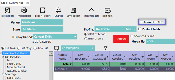 - When running a Stock Summaries Report for any Venue/s that use/s an alternate Local Currency to the Organization's Base Currency, the Convert to XXX flag can be used to toggle between viewing the data as the Venues' Local Currency or viewing as the Organization's Base Currency