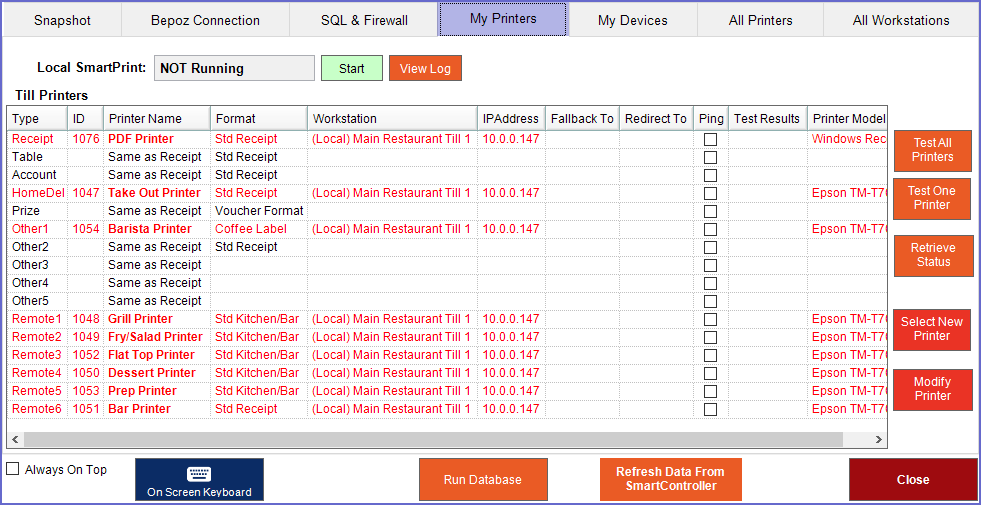 This article covers the "My Printers" tab of the Bepoz Diagnostics Dashboard. This tab will display a list of all the local printers that are installed in the system and allows for testing their status. In order to populate a printer list in Bepoz Diagnostics, Smart Printers needs to be active.