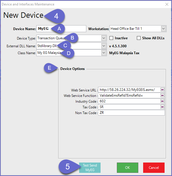 - Fill in the fields in the Device Options with the information which should be provided or obtained via MyEG and/or Tax Office