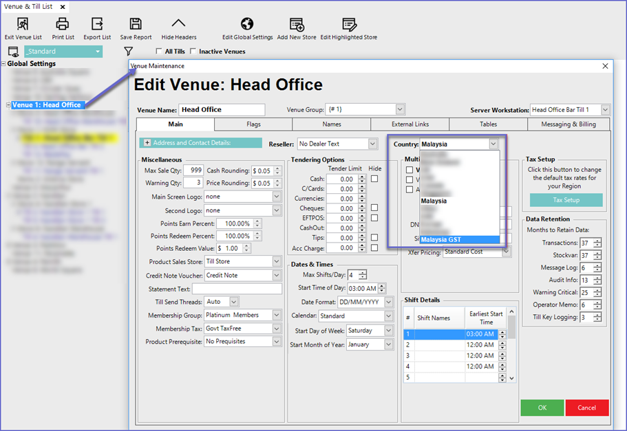 - Select the Venue, Stores & Tills option from the side menu within System Setup