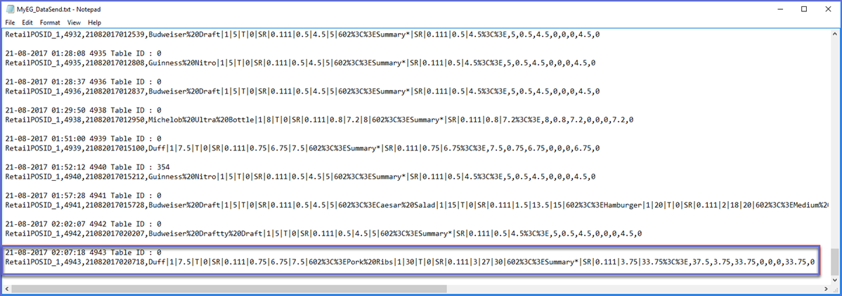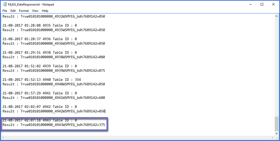 - Continuing from the above example, the Date & Time, Transaction Number, and Table ID will match that of the MyEG_DataSend.txt file and can be found in MyEG_DataResponse.txt file