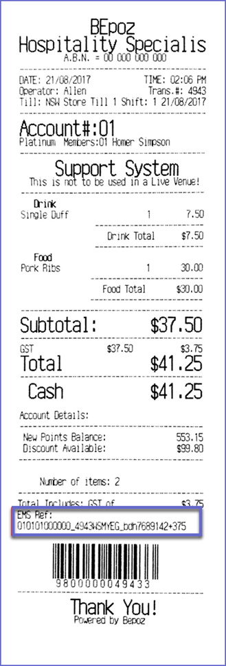 - The EMS Reference Number from the above example can be seen here – printed at the bottom of the customer receipt, just above the footer