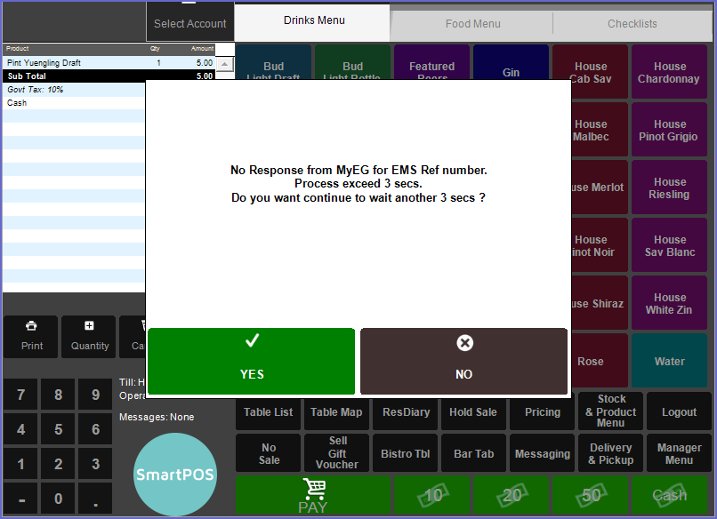 - If the connection attempt to MyEG is unsuccessful after the Payment has been processed for the Transaction, a timeout message will appear; if the Operator selects not to wait for a response from MyEG, the Receipt will print without a Reference Number