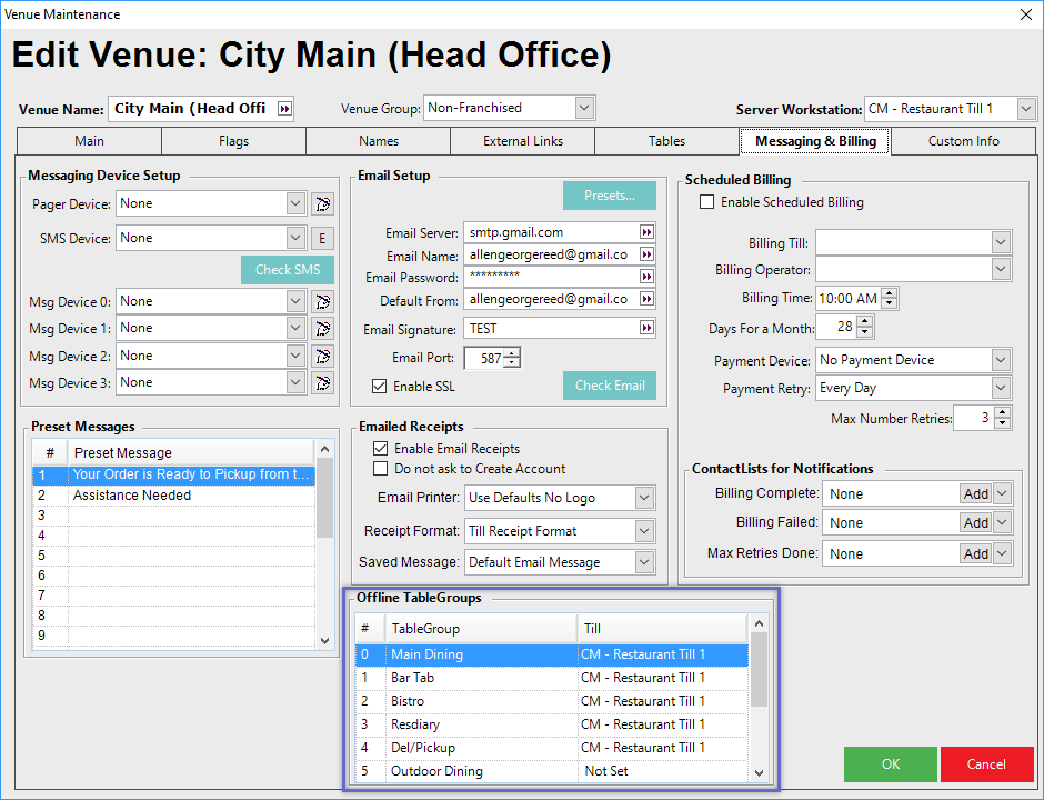 Offline Table Groups was added to the Messaging & Billing tab of Venue Maintenance