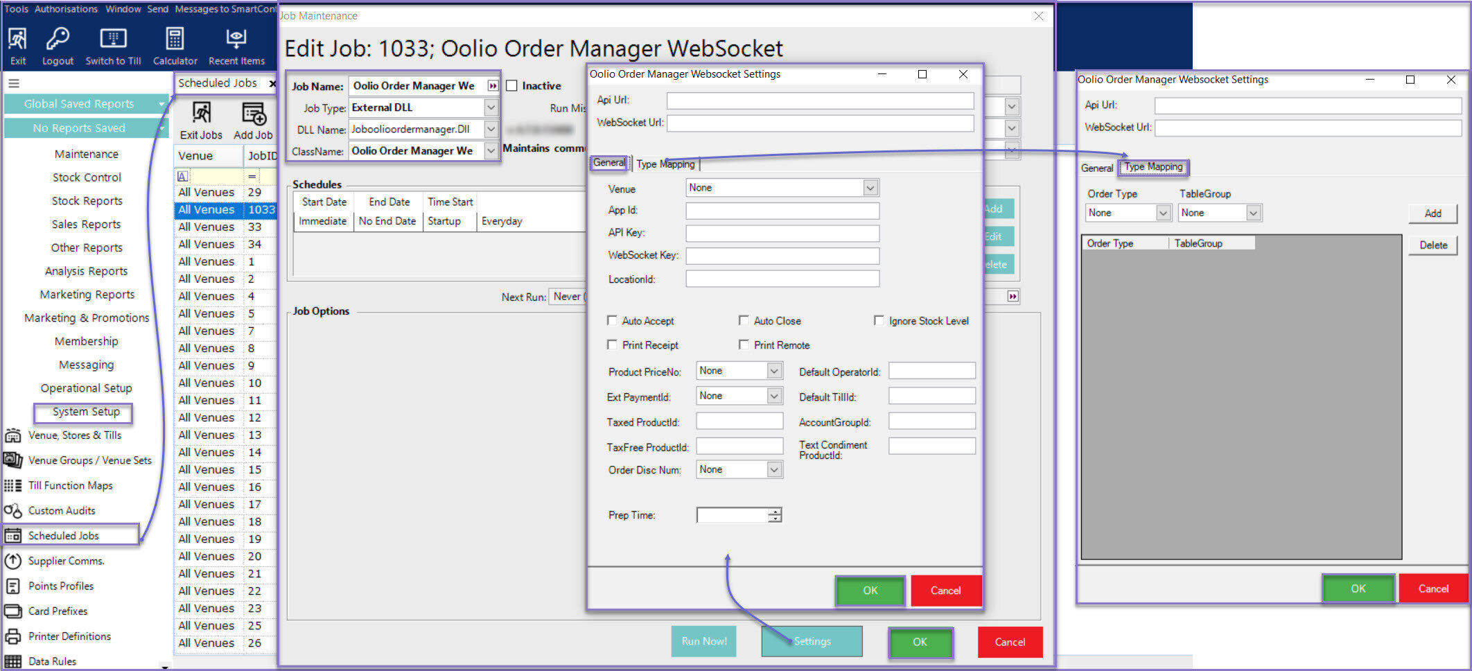 - This WebSocket scheduled job, once configured, communicates with Oolio Order Manager and receive orders to the SmartPOS